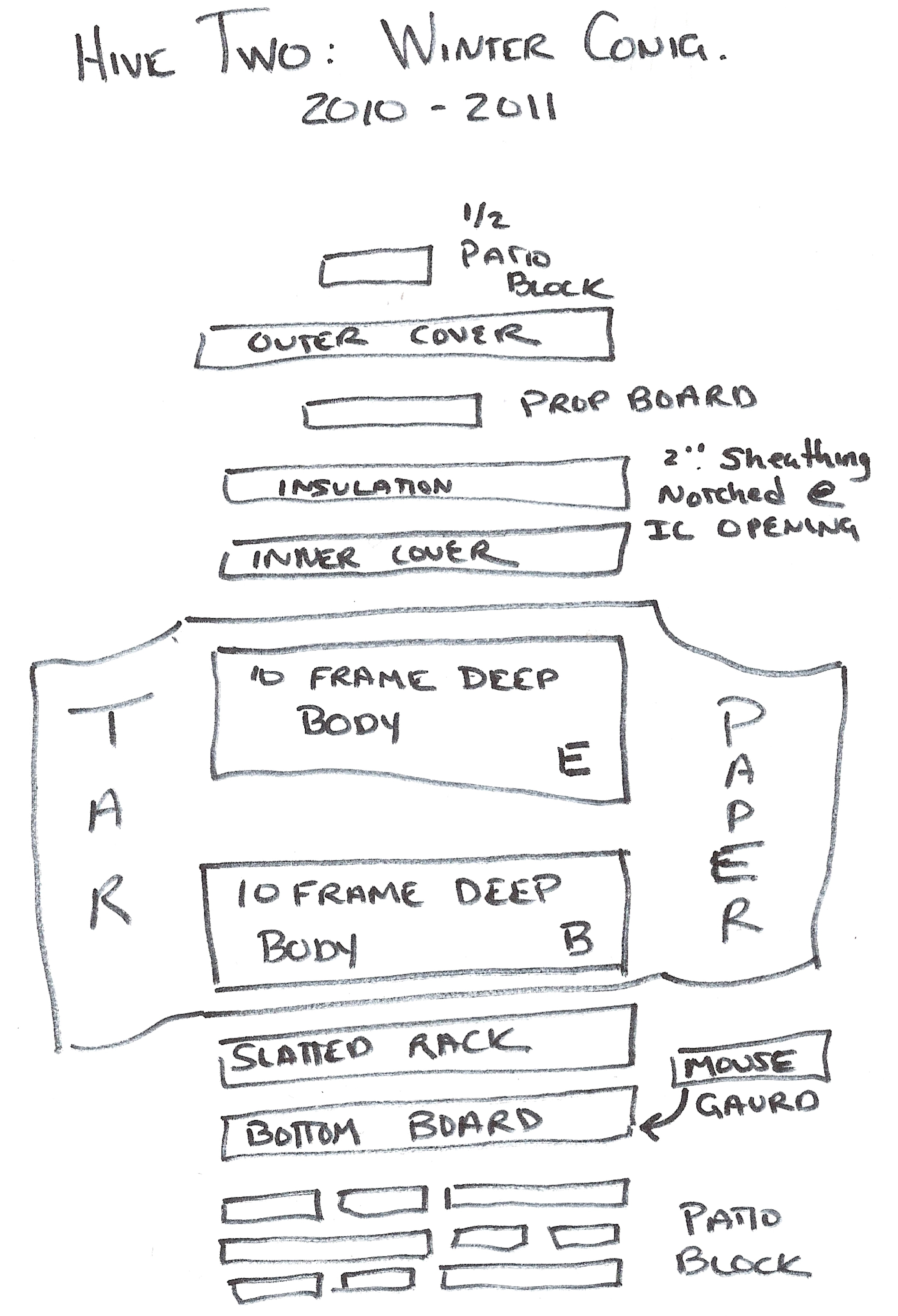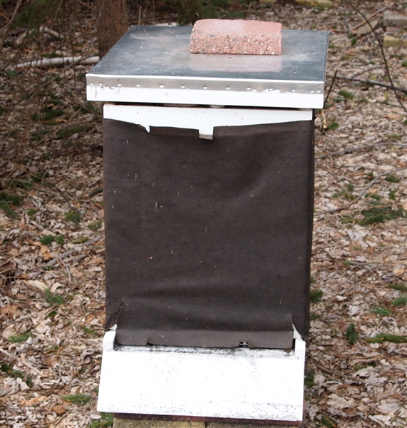 Saturday, March 19th, 2011Hive two had a large number of dead bees at the entrance, this was to be expected as I had not cleaned them off. The tar paper had also came loose and was removed. The streaks on the top have appeared over the winter and could be signs of nosema.
